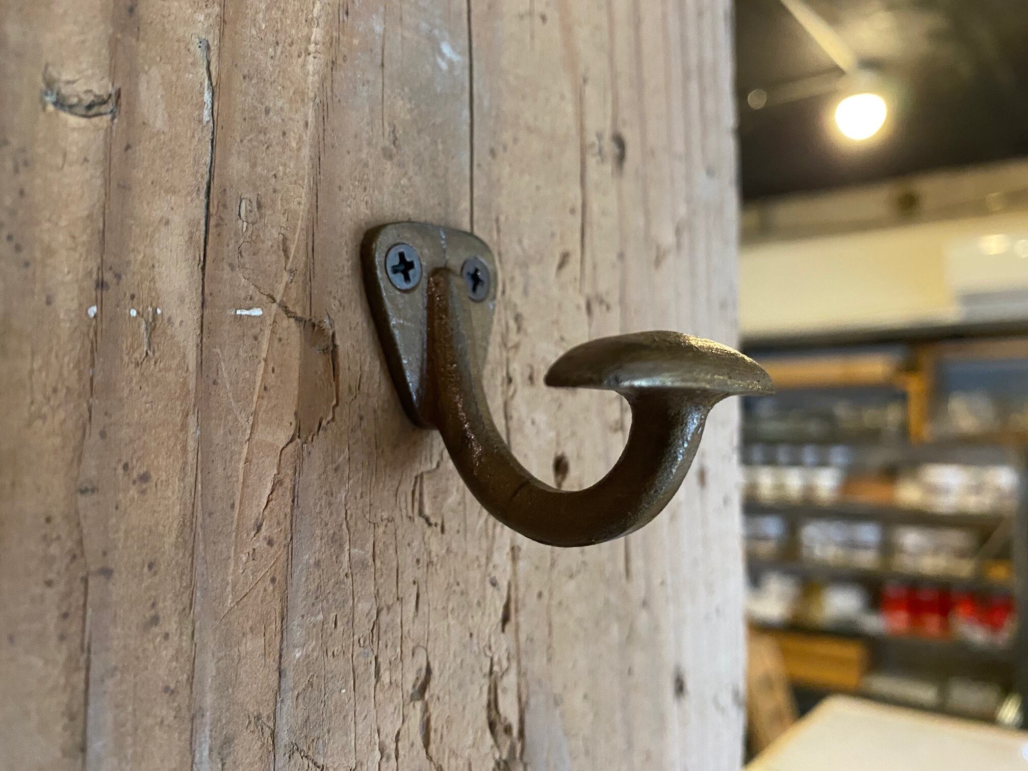 カバンや小さい荷物を掛けるのに便利なアイアンフックです。コンパクトなサイズ感は玄関や扉の裏などにはもちろん、壁や家具などの狭いスペースにも取り付け可能です。
