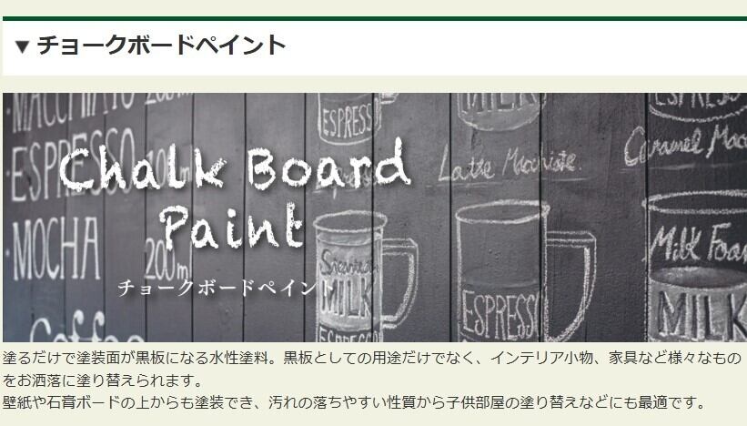 塗るだけで塗装面が黒板になる水性塗料。黒板としての用途だけでなく、インテリア小物、家具、木部、内壁、壁紙、建具など様々なものをお洒落に塗り替えられます。壁紙や石膏ボードの上からも塗装でき、汚れの落ちやすい性質や、ほとんど匂いが無いので子供部屋の塗り替えなどにも最適です。
