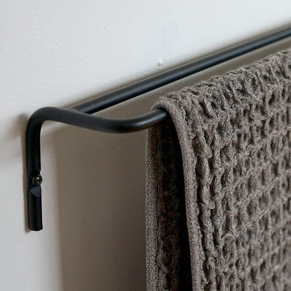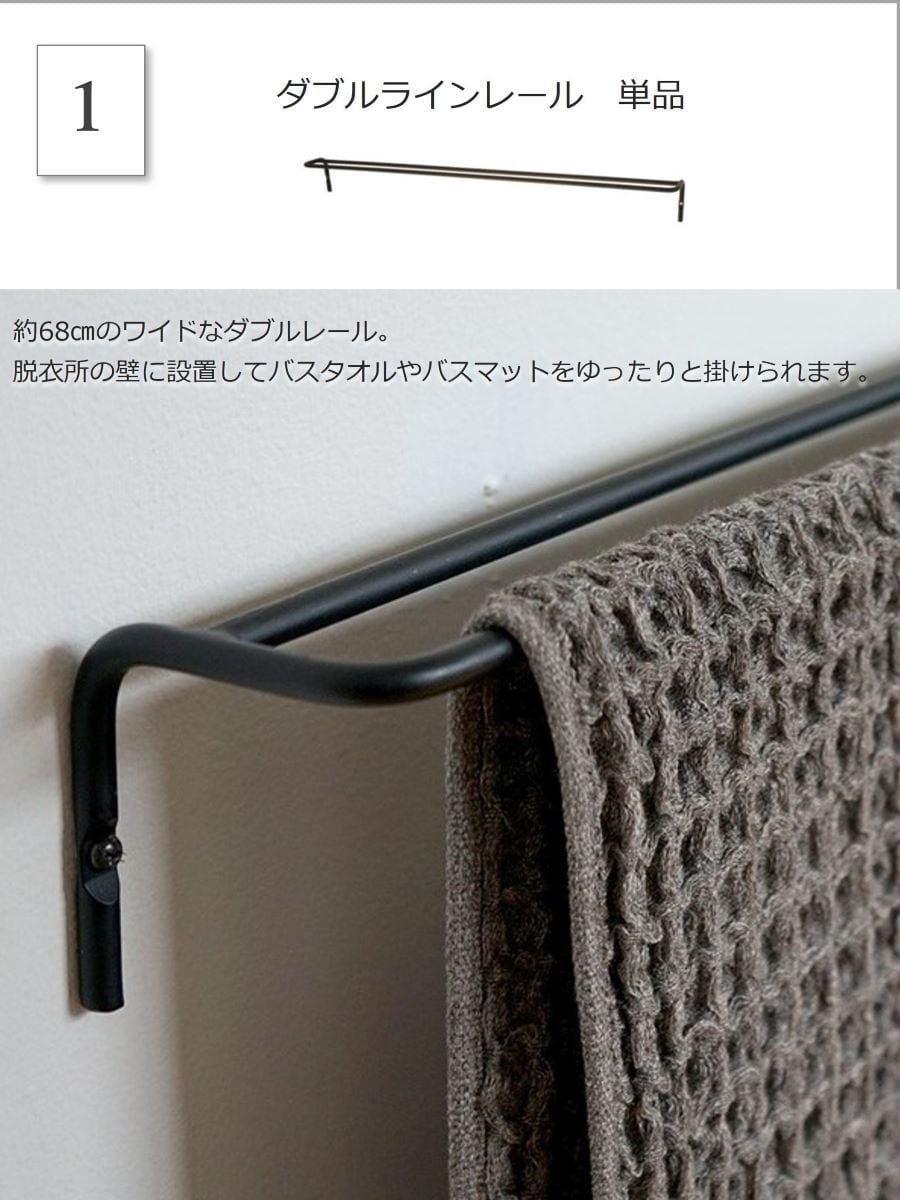 デンマーク語で「清潔」という意味を持つ「 ren (レン) 」。シンプルさと機能美を兼ね備えたアイアンパーツシリーズです。「ren ダブルラインレール」は、ゆったり使えるタオル掛け。付属のビスで壁に取り付けて設置します。バー部分が二重になっている構造は、タオルを掛けた時あいだに空間ができて、タオルが乾きやすいデザイン。フェイスタオルを折らずに掛けられるサイズなので、洗面所やバスルーム周りで活躍します。