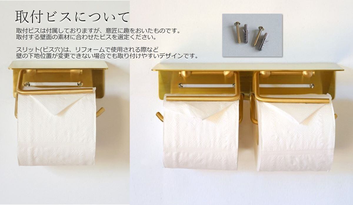 サテン加工を施した真鍮製で、上品な質感のペーパーホルダー。1連用。バー状の紙押さえがあるためペーパーが切りやすく、高齢の方や小さいお子様でも使いやすい仕様となっています。上部には棚も付いているため、携帯などを一時置きするのに便利に使用できます。スリット(ビス穴)は、リフォームで使用される際など壁の下地位置が変更できない場合でも取り付けやすいデザイン。