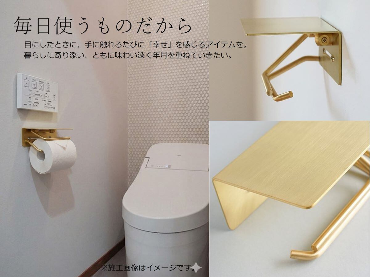 サテン加工を施した真鍮製で、上品な質感のペーパーホルダー。2連用。バー状の紙押さえがあるためペーパーが切りやすく、高齢の方や小さいお子様でも使いやすい仕様となっています。上部には棚も付いているため、携帯などを一時置きするのに便利に使用できます。スリット(ビス穴)は、リフォームで使用される際など壁の下地位置が変更できない場合でも取り付けやすいデザイン。