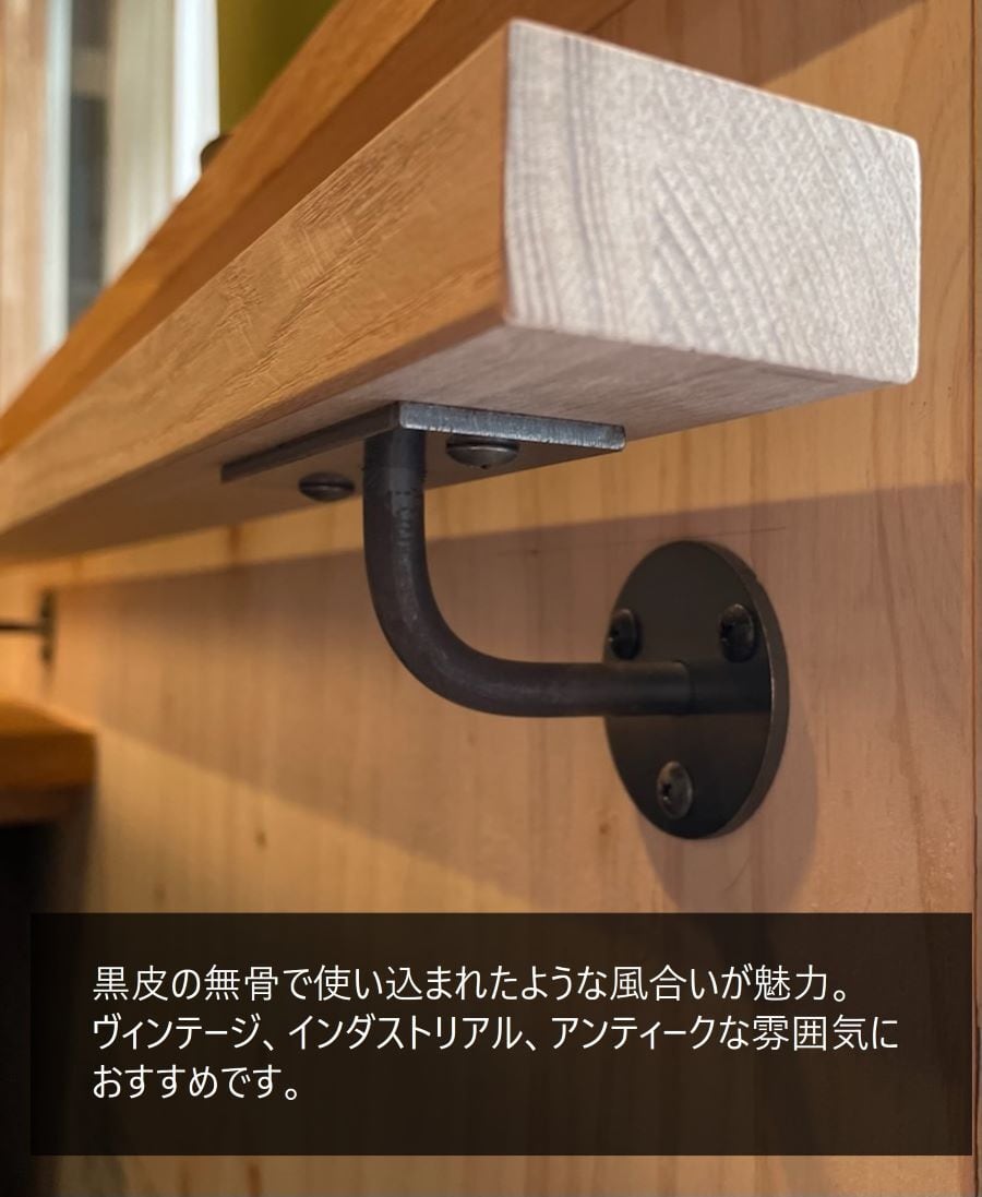 アイアンブラケットは鉄工所で1つ1つ職人さんに手作りしていただいているコダワリのアイテム。デザインはシンプルかつ無骨な黒皮仕上になっていますので素材の質感も楽しんでいただける金物です。DIYリノベーション,DIYリフォームにもオススメのアイテムです。